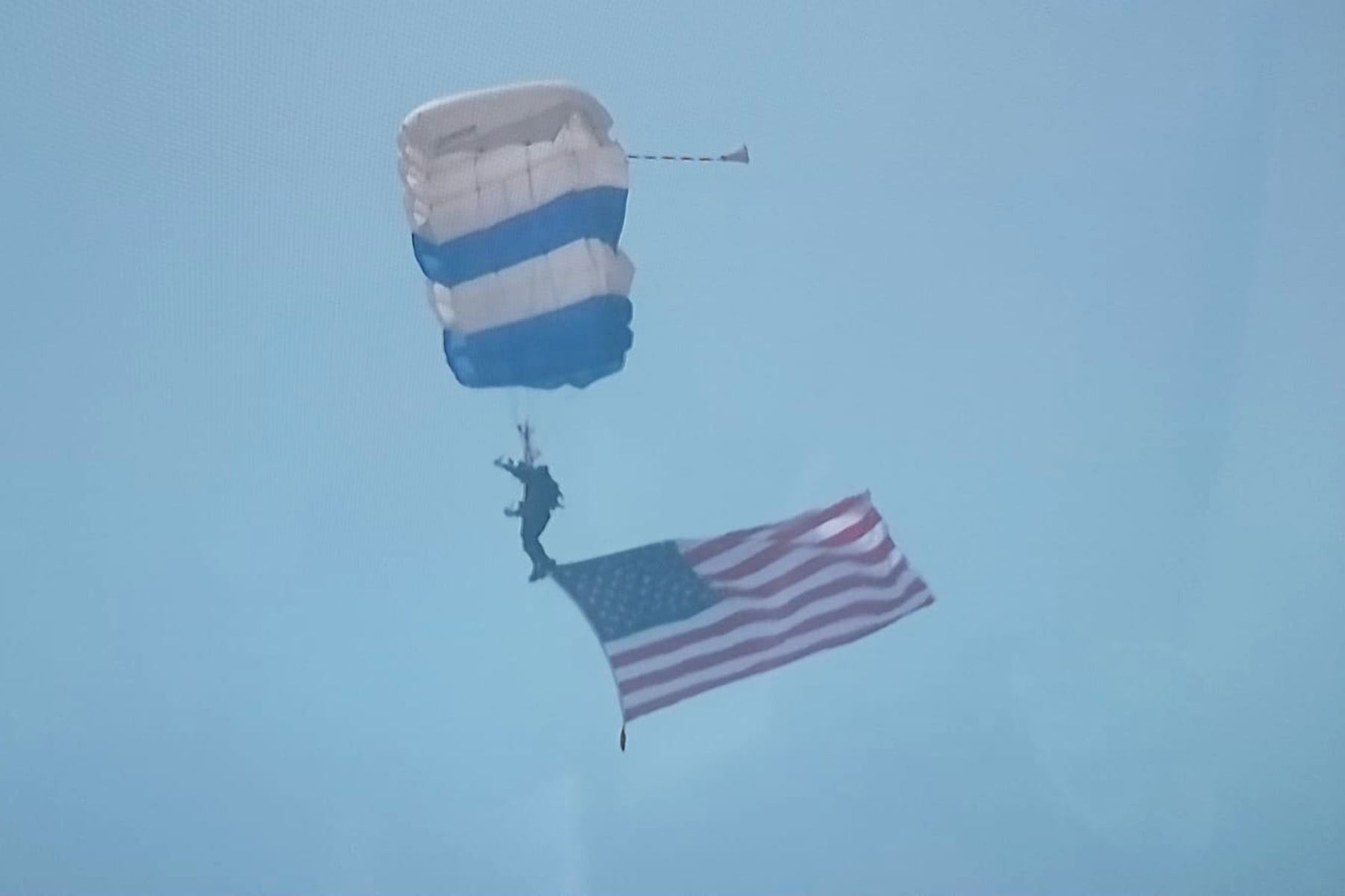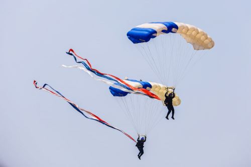 Uno de los momentos más emotivos de esta parte del show fue el descenso de los Caballeros Azules, el equipo de paracaidismo de las Fuerzas Especiales FAP, cuando uno de los comandos desplegó la bandera peruana ante la algarabía de los presentes. Por su parte, la escuadra Wings of Blue hizo lo propio con el emblema norteamericano.