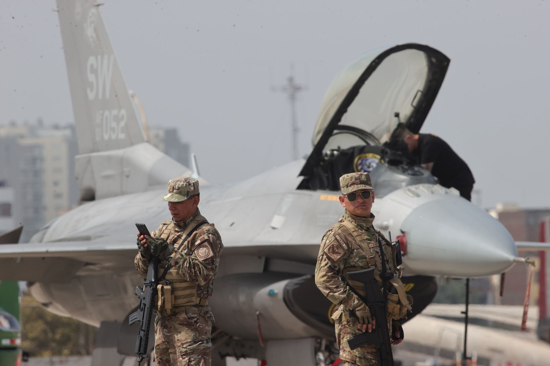 Dos aeronaves F-16 del Viper Demo Team de la Fuerza Aérea de los Estados Unidos en la Base Aérea Las Palmas, en Surco. (Foto: ANDINA/ Carlos Américo Lezama Villantoy)