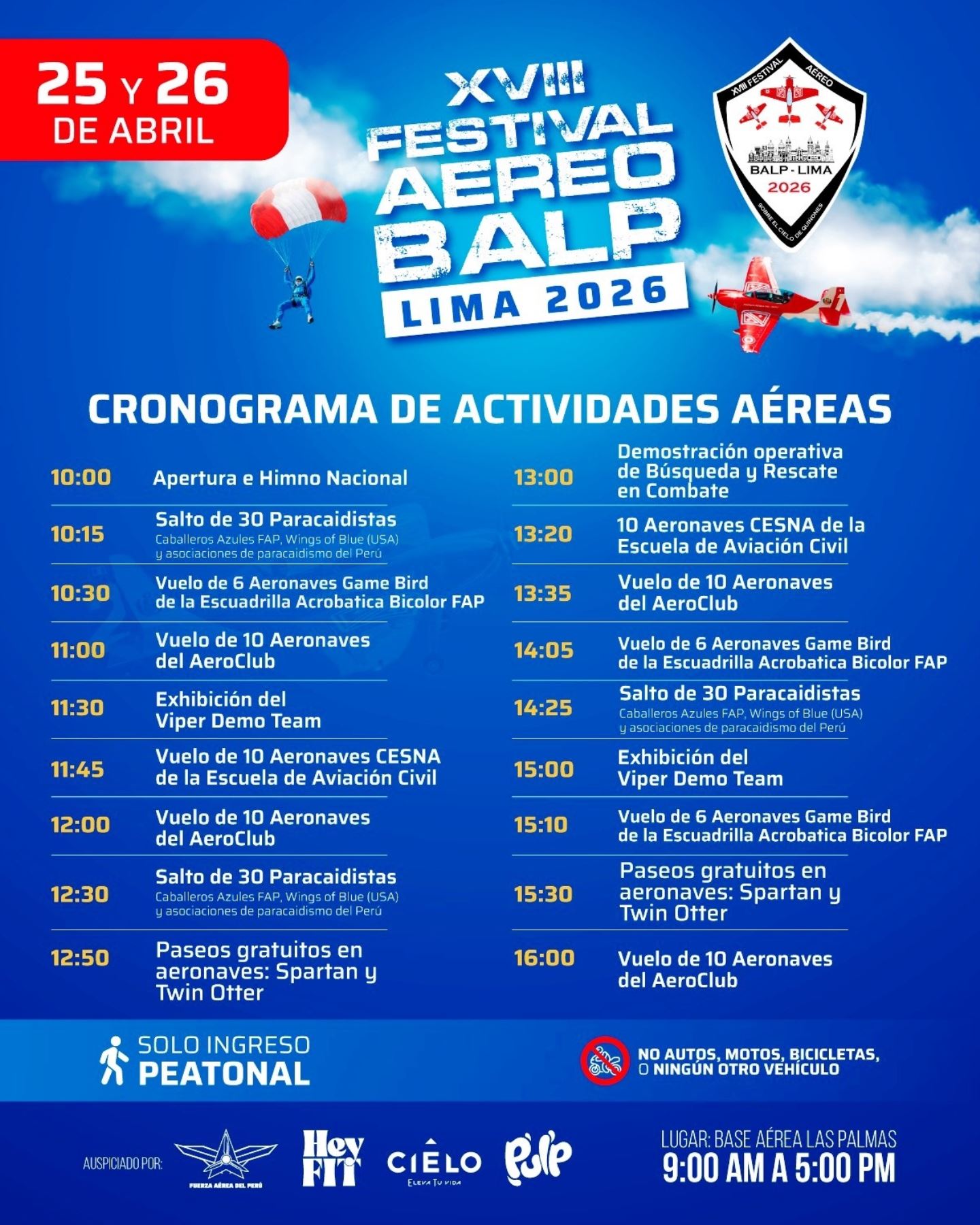 Este ensayo forma parte de los preparativos para el XVIII Festival Aéreo BALP Lima 2026, evento gratuito y familiar que se desarrollará este sábado 25 y domingo 26 de abril, desde las 9:00 a. m. hasta las 5:00 p. m., en la misma base aérea.
