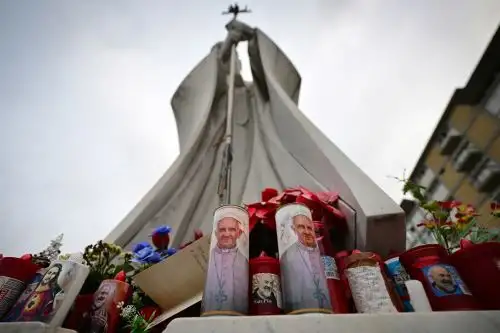 El altar, improvisado a los pies de una estatua de Juan Pablo en la que se Iee "No tengas miedo" frente a la entrada del centro médico, se ha colmado de flores, velas y muestras de afecto de personas llegadas de todo el mundo.