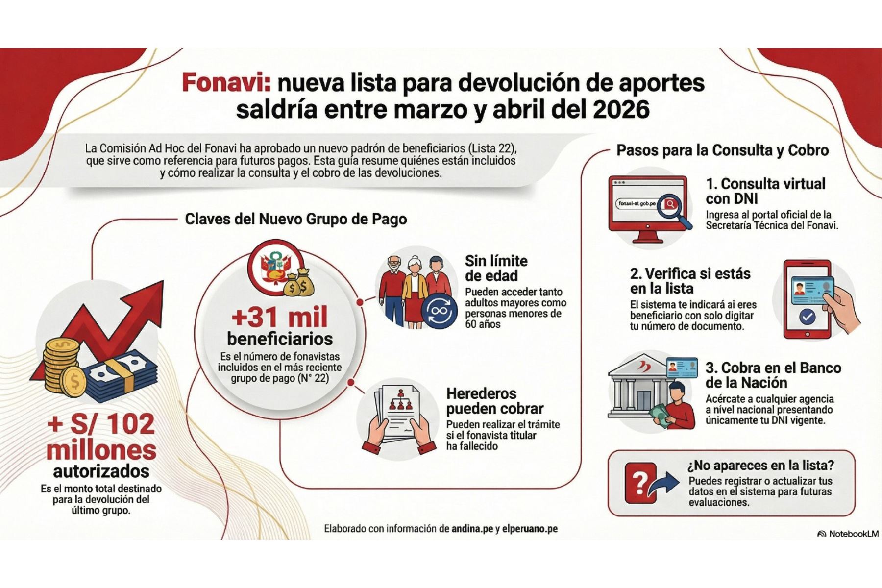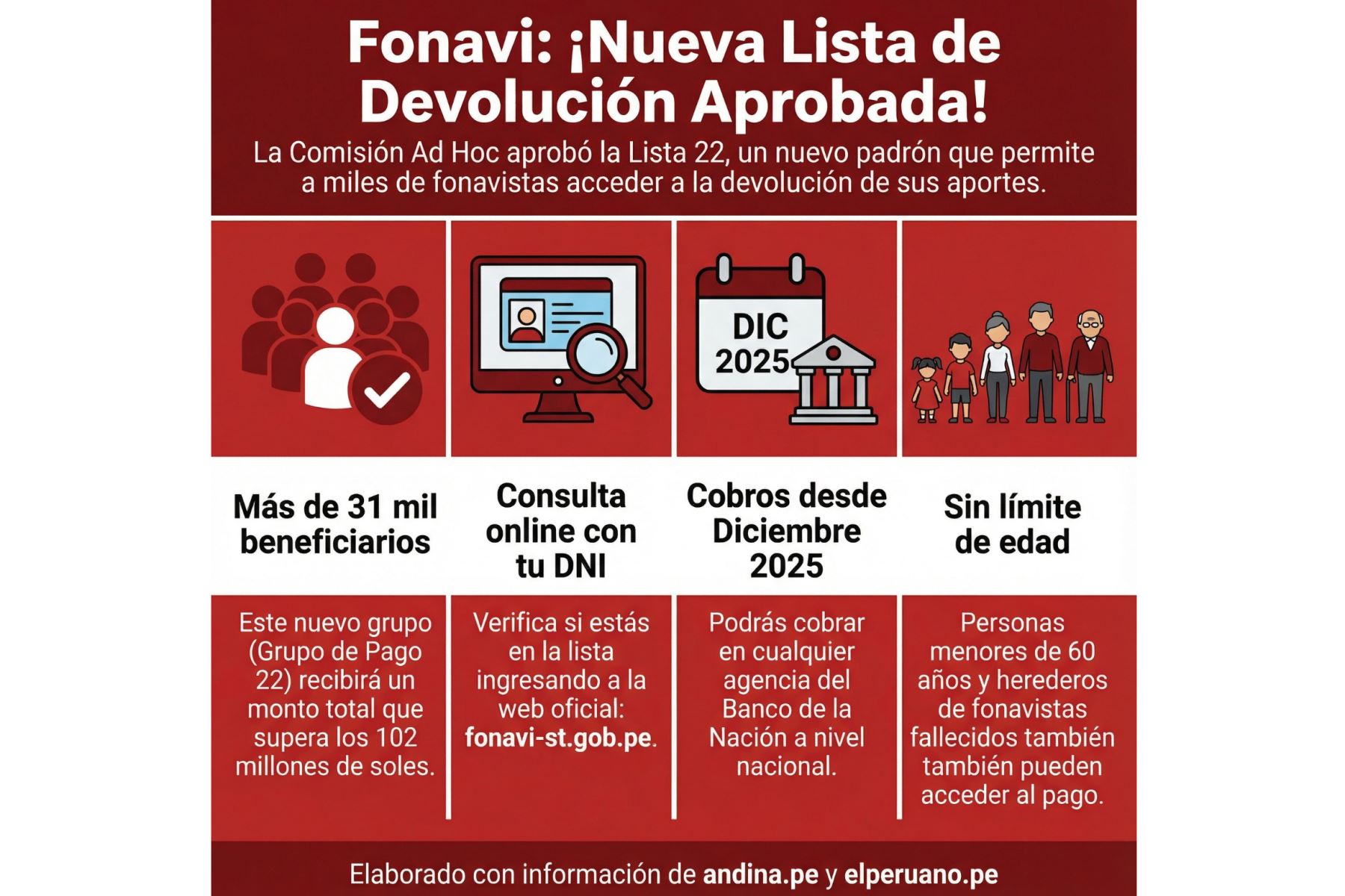Por su parte, la vocera de la Secretaría Técnica del Fonavi, Miluska Cabrera, exhortó a los exaportantes a verificar si forman parte del grupo de pago número 22 antes de acercarse a las agencias del Banco de la Nación, a fin de evitar desplazamientos innecesarios.