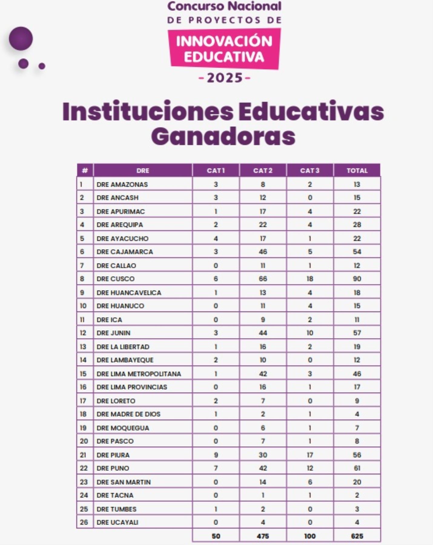 Las 625 IE ganadoras representan lo mejor de la innovación educativa peruana, con propuestas que integran tecnología, saberes locales y metodologías disruptivas. Para acceder a la lista de los 625 colegios ganadores,