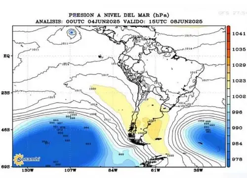 Anticiclón del Pacífico Sur, un sistema de alta presión atmosférica que empuja los vientos fríos desde el sur del continente, especialmente desde Chile, hacia el interior de Sudamérica.