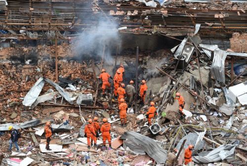 Los bomberos continuaban buscando entre los escombros, con perros rastreadores, más víctimas.