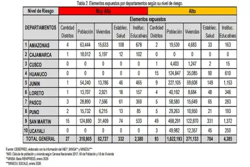 Según el citado documento, San Martín es el departamento con la mayor cantidad de distritos en riesgo muy alto, con 15; seguido de Amazonas (4), Pasco (3), Puno (2) y Cajamarca, Junín y Loreto (1 cada uno), sumando un total de 27 distritos.