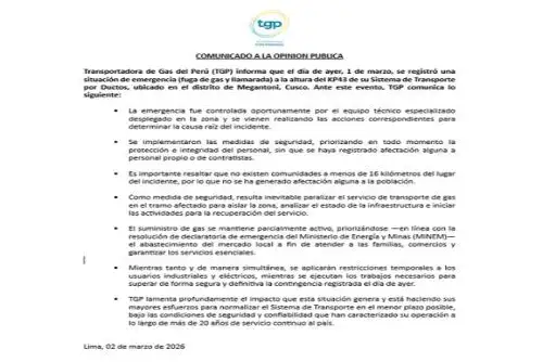 La empresa Transportadora de Gas del Perú (TGP) informó que el suministro de gas se mantiene parcialmente activo tras la emergencia de fuga de gas y llamarada ocurrida a la altura del “KP43” del sistema de transporte por ductos en el distrito de Megantoni, provincia de La Convención, región Cusco.
