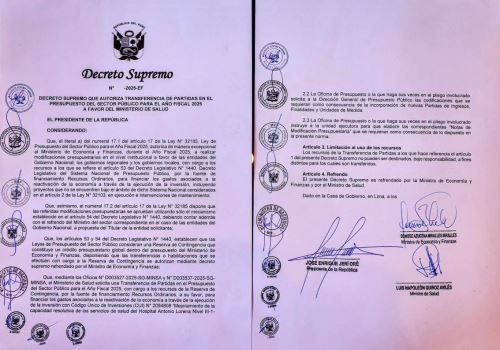 El Decreto Supremo está refrendado por el presidente José Enrique Jerí Oré, la ministra de Economía Denisse Miralles y el ministro de Salud Luis Napoleón Quiróz.