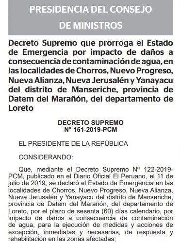 El Gobierno prorrogó el estado de emergencia, por impacto de daños a consecuencia de la contaminación del agua, en las comunidades de Chorros, Nuevo Progreso, Nueva Alianza, Nueva Jerusalén y Yanayacu, ubicadas en el distrito de Manseriche, provincia de Datem del Marañón, en Loreto.