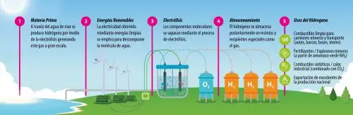 El hidrógeno verde se produce con energías renovables como la solar o eólica, lo que significa que es sostenible ya que se obtiene sin generar emisiones contaminantes.