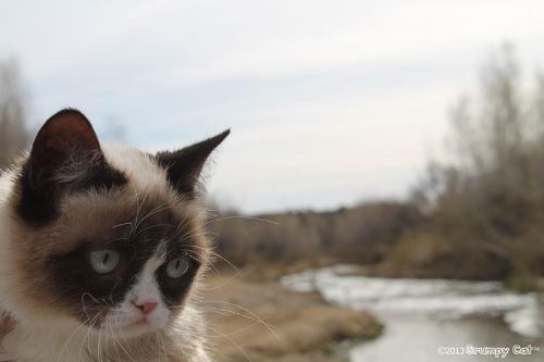 "Podría haber un padre diferente… ya sabes que los gatos son promiscuos".El nombre real de esta gatita es Tardar Sauce y llegó al mundo el 4 de abril de 2012. Su tamaño es pequeño y la forma de su rostro posiblemente sea producto del enanismo felino que sufre. Si no fuera porque su pequeño trasero se tambalea al caminar, seria un gato perfecto. Aunque para muchos de sus fans ya es perfecto@.