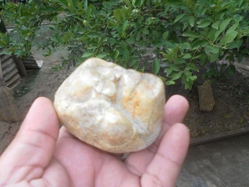 La pieza dental, que pesa un promedio de 400 gramos, tiene una mitad fosilizada y la otra intacta, y permanece bajo el cuidado del agente municipal de la zona, Víctor Altamirano Delgado, propietario de la parcela de cinco hectáreas de arroz.