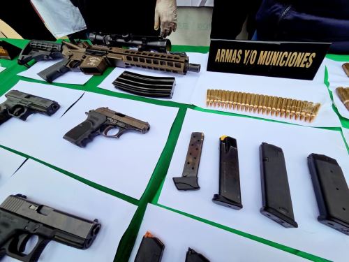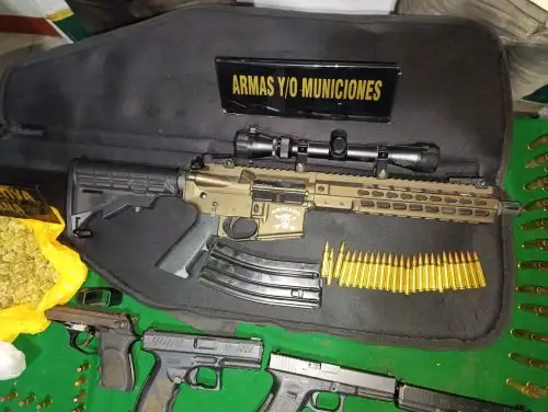 Entre el arsenal incautado figuran cuatro armas de fuego (pistolas), un fusil modelo R15- 58, municiones calibre 5.56, calibre 7.62x7, calibre 380, cacerinas para pistola, una cacerina para fusil, cinco celulares, dos artefactos explosivos, una nota extorsiva, una motocicleta con requisitoria, un vehículo miniván y un automóvil.