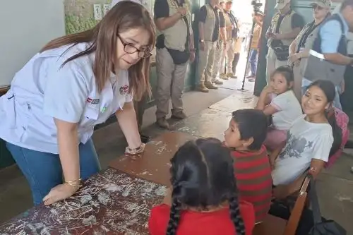 La ministra de Educación, Miriam Ponce Vértiz, supervisó este martes la entrega de material escolar en la Institución Educativa N° 22526 Medardo Aparcana en el distrito de Ocucaje, región Ica.