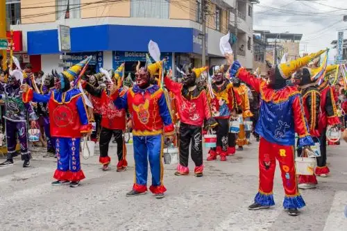 Entre los personajes centrales destaca el Ño Carnavalón, figura simbólica que recorre los barrios tradicionales acompañado de pandillas, bombos y comparsas que marcan el pulso festivo. Barrios emblemáticos como Quinapata, Consuelo y Cascayunga se convierten en escenarios donde lo religioso y lo profano conviven bajo la protección del Santo Cristo de Bagazán, símbolo espiritual profundamente arraigado en la devoción local.
