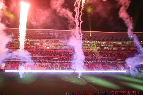 Un impresionante espectáculo de luces y percusión deleitó al público que se dio cita en la ceremonia inaugural del remozado Estadio Nacional, convertido en uno de los más modernos del mundo, al contar con un sistema de iluminación que permite la transmisión de partidos en alta definición (HD).