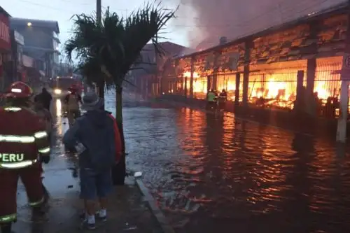 Decenas de bomberos combaten un incendio que afecta desde la madrugada de hoy a un centro comercial ubicado en la ciudad de Iquitos, capital de la región Loreto.