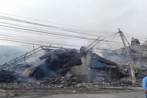 Hasta el cierre de esta nota, se continuaba trabajando para terminar de enfriar los escombros del edificio colapsado, y retirar los que cayeron sobre la calle. Foto: Cortesía Daniel Lázaro.