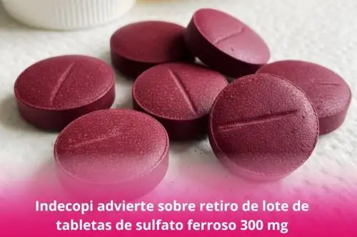 El Indecopi, a través de su Sistema de Alertas de Consumo, informó que la Dirección General de Medicamentos, Insumos y Drogas (Digemid) dispuso el retiro y destrucción de todas las unidades del lote 2077104 del producto farmacéutico tableta recubierta de sulfato ferroso 300 mg, presentación en caja por 100 unidades, con registro sanitario EN-05853, fabricado en el Perú.