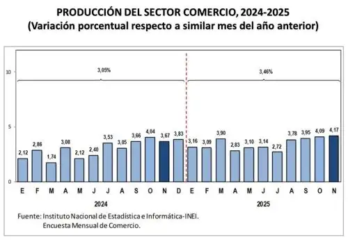 El sector Comercio reportó un crecimiento de 4.17%, en noviembre del año pasado, en comparación con lo registrado en similar mes del 2024, debido al aumento en las actividades de comercio al por mayor, comercio al por menor y comercio automotriz, informó hoy el Instituto Nacional de Estadística e Informática (INEI).