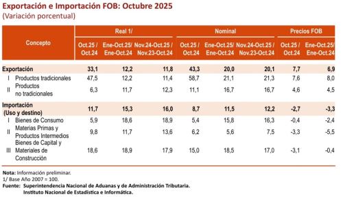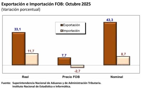 El volumen total exportado de bienes se expandió 33.1% en octubre del 2025 en comparación con el mismo mes del año anterior, la tasa más alta en lo que va del año y de los últimos 53 meses, reportó el Instituto Nacional de Estadística e Informática (INEI).