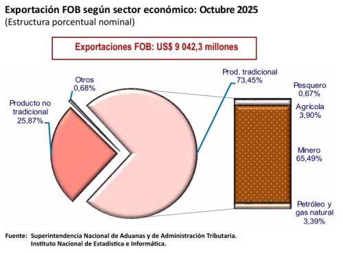 Las exportaciones tradicionales aumentaron en 47.5%, en el mes analizado respecto a octubre del 2024. Entre los productos tradicionales mineros exportados destacaron los envíos de cobre (49,3%), principal impulsor de las exportaciones.