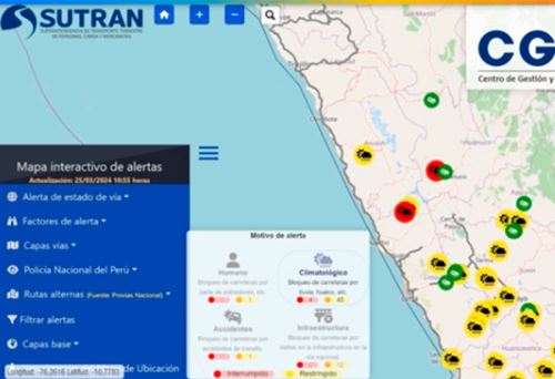 La Sutran, entidad adscrita al Ministerio de Transportes y Comunicaciones (MTC), precisó que la plataforma consolida información oficial y verificada proveniente de diversas fuentes estratégicas, como la Policía Nacional del Perú (PNP), el Centro de Operaciones de Emergencia Nacional (COEN), empresas concesionarias de carreteras y el personal de fiscalización desplegado a lo largo de la Red Vial Nacional.