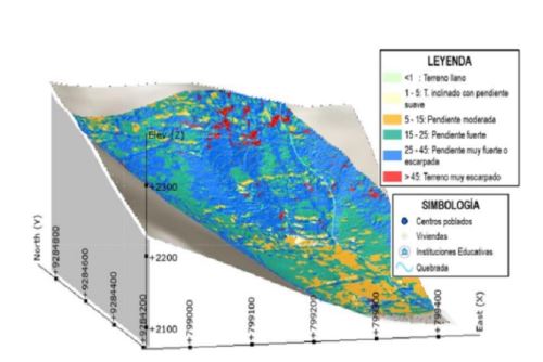 Los peligros están condicionados por factores geomorfológicos y litológicos, pendientes que varían de fuerte a pendiente muy fuerte o escarpada y depósitos coluvio deluviales, material no consolidado, susceptible a procesos de erosión y transporte. Estas condiciones facilitan el desplazamiento de grandes volúmenes de material cuando se presentan precipitaciones extraordinarias.