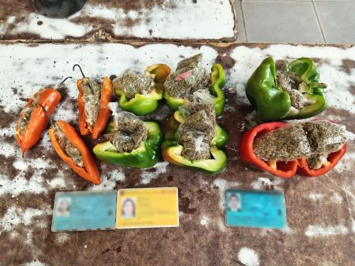 penal de Piura al revisar 1 pimentón color verde se hallaron 3 bolsas de polietileno transparente con medidas de 12 x 4 cm, 12 x 4 cm y 11 x 6 cm, que ocultaban la sustancia verduzca. En otro pimentón color verde se encontraron 2 bolsas con medidas de 12 x 5 cm y 12 x 4 cm. El tercer pimentón color verde ocultaba 3 bolsas con medidas de 13 x 5 cm, 13 x 5 cm y 12 x 5 cm.
