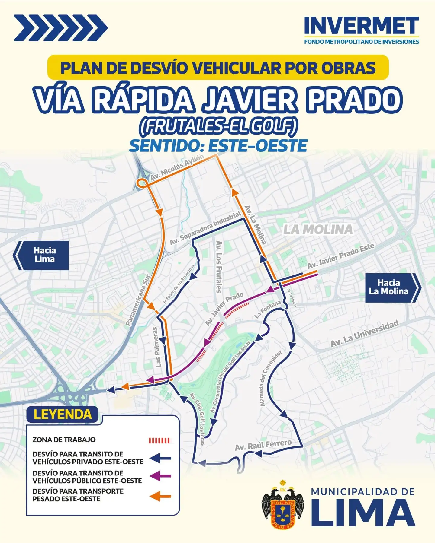 La vía rápida Javier Prado Frutales-El Golf forma parte del plan vial metropolitano impulsado por la Municipalidad de Lima y busca mejorar la conexión hacia la Panamericana Sur, contribuyendo a una circulación más fluida y ordenada en esta zona estratégica de la ciudad.