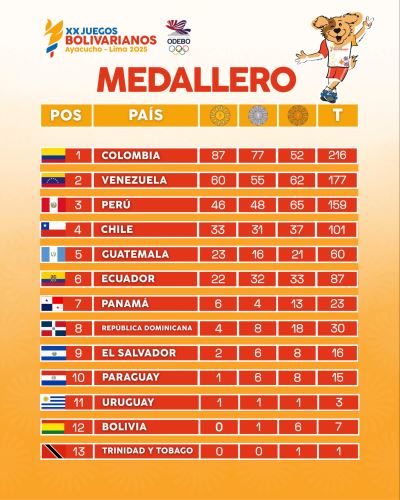 Colombia se mantiene en lo más alto con 216 medallas (87 de oro, 77 de plata y 52 de bronce; segundo sigue Venezuela con 177 (60 de oro, 55 de plata y 62 de bronce) y en el cuarto puesto está Chile con 101 (33 de oro, 31 de plata y 37 de bronce).