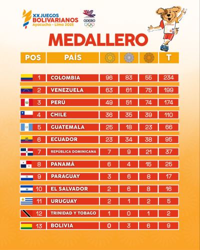 Con la consigna de seguir superando marcas en la obtención de medallas, el equipo nacional continúa con su cosecha en los Juegos Bolivarianos Ayacucho-Lima 2025 para consolidarse en el tercer lugar con la suma de 174 preseas, suma que le permite acercarse a sus registros máximos históricos en la competencia.