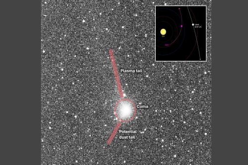 La imagen, tomada el 2 de noviembre de 2025, muestra al cometa 3I/ATLAS rodeado por una brillante coma o halo de gas. Además, se pueden distinguir dos colas: una de plasma, visible como un flujo de gas cargado eléctricamente que se extiende hacia la parte superior del encuadre, y una posible cola de polvo, compuesta por diminutas partículas sólidas, que aparece más tenue hacia la esquina inferior izquierda.