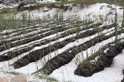 La intensa granizada registrada el último sábado afectó un total de 70 hectáreas de campos de cultivos situados en los centros poblados de Chacapampa, Huaychulo, San Juan, Puquio, Santa Cruz y la Unión, del distrito de San Juan de Jarpa, en la provincia de Chupaca, región Junín.