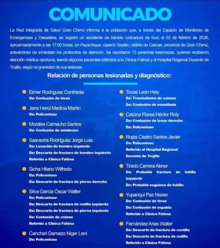 La Red de Salud de Gran Chimú brindó la identidad y el diagnóstico médico de las 13 personas que resultaron heridas a consecuencia de la volcadura de un bus de la empresa JK, registrado la tarde del 3 de febrero en el sector Payachique, caserío Septén, distrito de Cascas, en la región La Libertad.