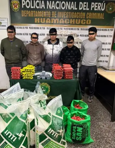 El Comando de la Tercera Macro Región Policial informó que agentes del Departamento de Investigación Criminal Huamachuco detuvo a cinco personas, a quienes se les investiga por la tenencia ilegal de 950 emulsiones explosivas, fulminantes, mechas con detonadores y sacos de nitrato de amonio, material destinado presumiblemente a actividades ilícitas.