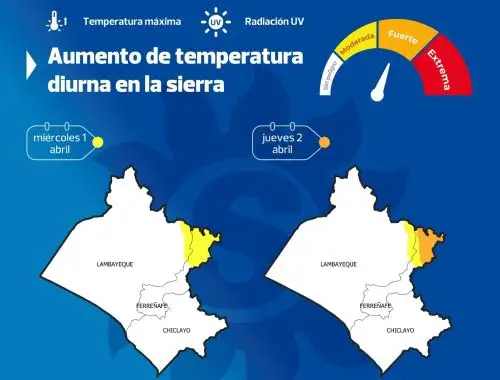La región Lambayeque se encuentra bajo el Aviso Meteorológico N.° 119, emitido por el Servicio Nacional de Meteorología e Hidrología del Perú, que alerta sobre el aumento de la temperatura máxima durante el día en la sierra.