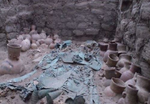 tumba del Señor de Úcupe, un gobernante de alto rango descubierto por el equipo liderado por el arqueólogo Steve Bourget, quien fue enterrado con placas de cobre dorado y máscaras funerarias.