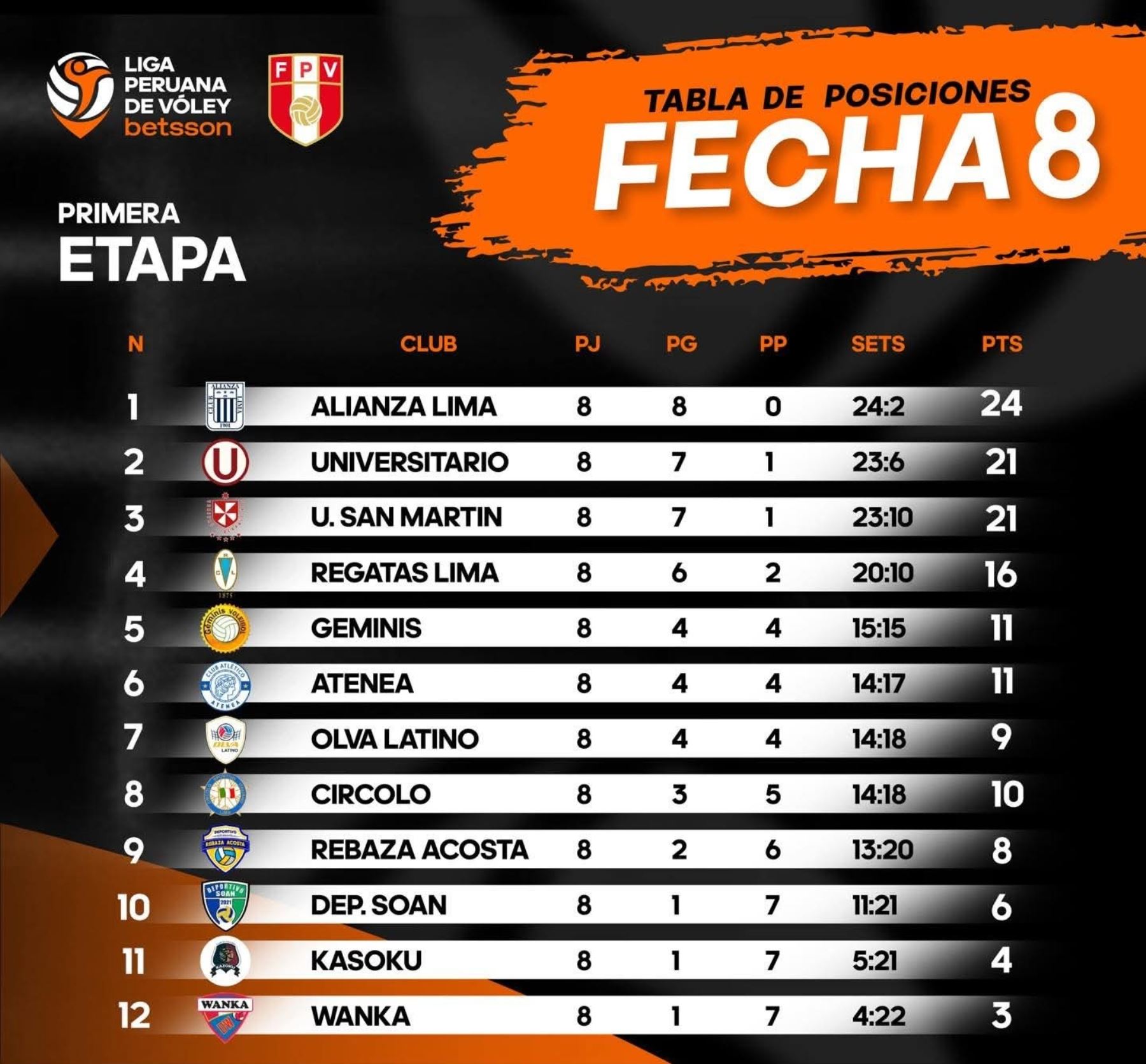 Tras ocho fechas disputadas, Alianza Lima lidera la clasificación con 24 puntos. Universitario se mantiene como escolta con 21 unidades, seguido de cerca por la Universidad San Martín, que suma 18. En la cuarta posición aparece Regatas Lima con 16 puntos, en una tabla que promete seguir ajustada conforme avanza el torneo.