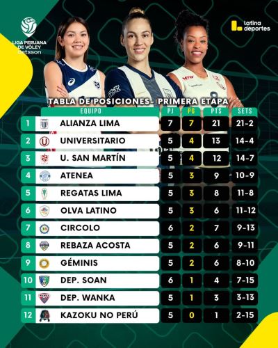 La Liga Peruana de Vóley continúa cosechando emociones con sus partidos bien disputados como el que Regatas Lima venció 3-2 a la Universidad San Martín, que pone a Alianza Lima como único líder; Universitario no se quedó atrás al derrotar 3-0 a Kazoku No Perú.