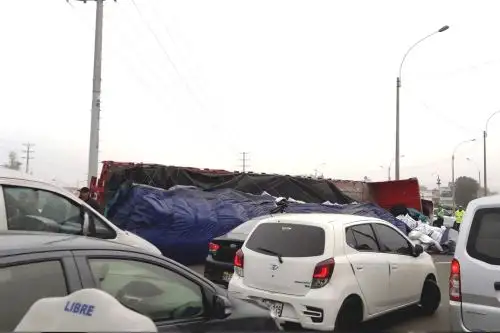 Un tráiler que transportaba harina de pescado se volcó a la altura del óvalo Narajal, en la Panamericana Norte, en Los Olivos, generando una intensa congestión vehicular.
