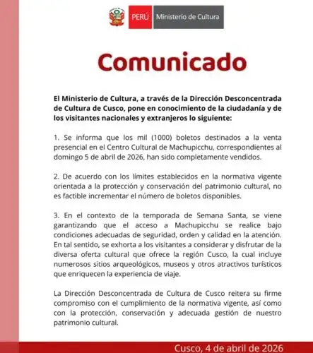 El Ministerio de Cultura, a través de la Dirección Desconcentrada de Cultura de Cusco, informó que se agotaron los 1,000 boletos de ingreso a la ciudadela inca de Machu Picchu, correspondientes al domingo 5 de abril, disponibles para venta presencial en el Centro Cultural del distrito de Machu Picchu Pueblo.