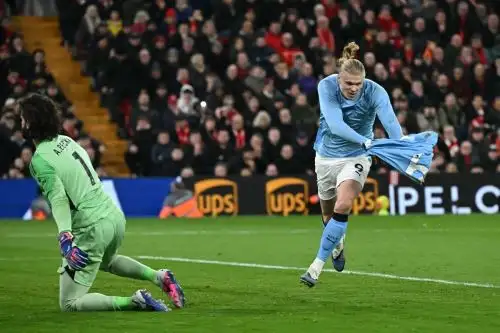 Erling Haaland anota el gol del triunfo ante el Liverpool en Anfield