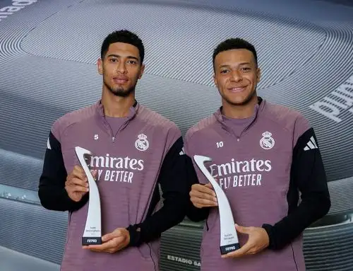 Mbappé acabó la temporada 2024/25 como 'Bota de Oro', con los 44 goles que marcó en todas las competiciones en su primera temporada con el Real Madrid. Bellingham, que se encuentra en un proceso de recuperación de un mes de una lesión muscular y posó con rostro serio con el trofeo, logró 15 goles el pasado curso y repartió 15 asistencias.
