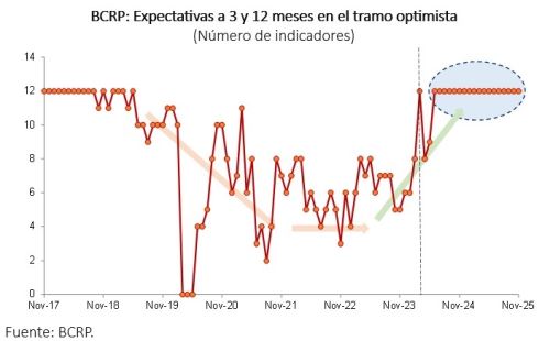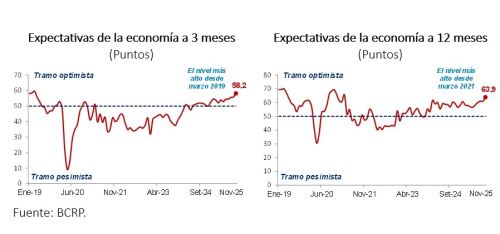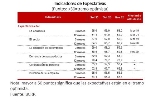 El Ministerio de Economía y Finanzas (MEF) informó hoy que, por decimoctavo mes consecutivo, los 12 indicadores de expectativas empresariales a 3 y 12 meses se mantuvieron en noviembre de 2025 en el tramo optimista, lo que evidencia la confianza del sector privado en el renovado dinamismo que viene mostrando la economía peruana.