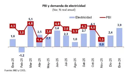 Según información consolidada por el Ministerio de Economía y Finanzas (MEF), la demanda eléctrica se aceleró y creció 3.9% interanual en enero del 2026, por encima de lo registrado en diciembre (2.4%) y noviembre (0.9%) del 2025. Este indicador líder de la producción nacional es uno de los principales referentes del desempeño económico, debido a su alta correlación con el Producto Bruto Interno (PBI).