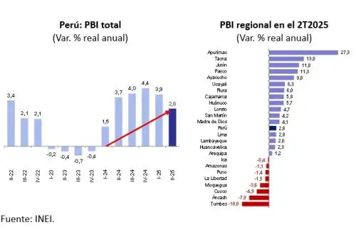 El Ministerio de Economía y Finanzas (MEF) destacó que dos regiones lideraron los crecimientos de las regiones del Perú durante el segundo trimestre del 2025: Apurímac (27.3 %) y Tacna (13.8 %). Junto a ellas Junín (11.8 %) y Pasco (11.3 %) lograron incrementos de dos dígitos en su actividad económica.