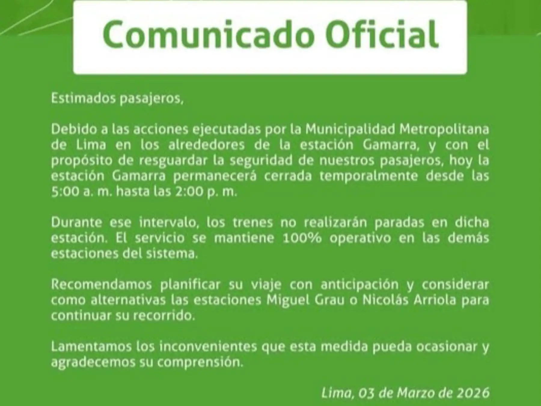 La concesionaria lamentó los inconvenientes que esta medida pueda ocasionar y agradeció la comprensión de los usuarios, reiterando que la estación retomará sus operaciones habituales a partir de las 2:00 p. m., salvo que se informe lo contrario.