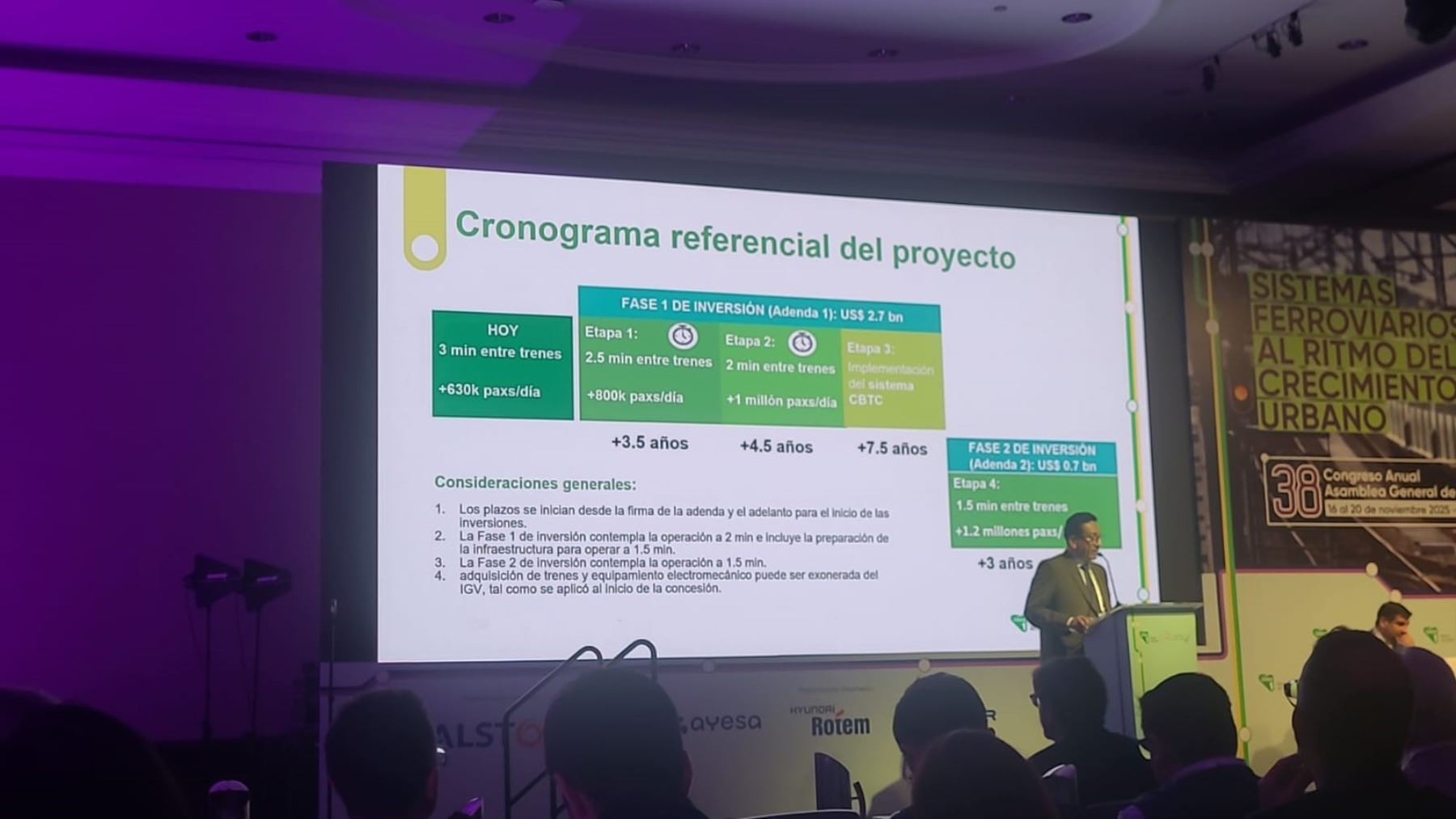 Durante su participación en el 38.º Congreso Anual de la Asociación Latinoamericana de Metros y Subterráneos (Alamys), el funcionario destacó que la Línea 1 del Metro de Lima moviliza hoy más de 600 mil personas al día, conectando 11 distritos en 34.6 kilómetros entre San Juan de Lurigancho y Villa El Salvador.