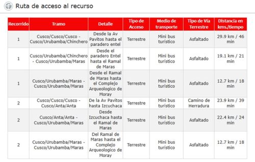 Existen dos rutas desde la ciudad de Cusco para llegar al complejo arqueológico de Moray. La primera comprende el trayecto por las provincias de Urubamba y Chincheros en buses, minibuses u otros vehículos de transporte turístico desde la avenida Pavitos de la Ciudad Imperial hasta el paradero Entel, recorriendo una vía asfaltada de 29.9 kilómetros equivalente a 46 minutos aproximadamente. A continuación, hay que avanzar otros 19 kilómetros de vía asfaltada hasta el ramal de Maras en un tiempo aproximado de 21 minutos. Finalmente, se avanza por autopista unos 12.7 kilómetros en un tiempo aproximado de 18 minutos, hasta llegar al centro poblado de Mullak’as Misminay y al sitio arqueológico de Moray.
