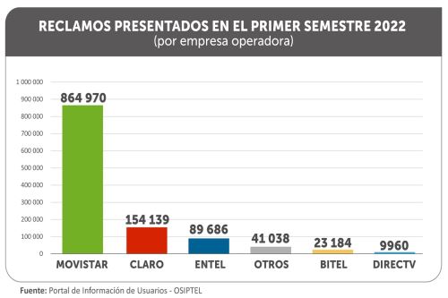 Movistar fue la empresa que concentró la mayor cantidad de reclamos presentados, con 864,970, equivalente al 73.12 % del total. A una considerable distancia se ubicaron Claro con 154,139 reclamos (13.03 %) y Entel con 89,686 (7.58 %). En tanto, Bitel y DirecTV registraron 23,184 (1.96 %) y 9,960 (0.84 %) reclamos, respectivamente; mientras que otras empresas registraron 41,038 reclamos (3.47 %).